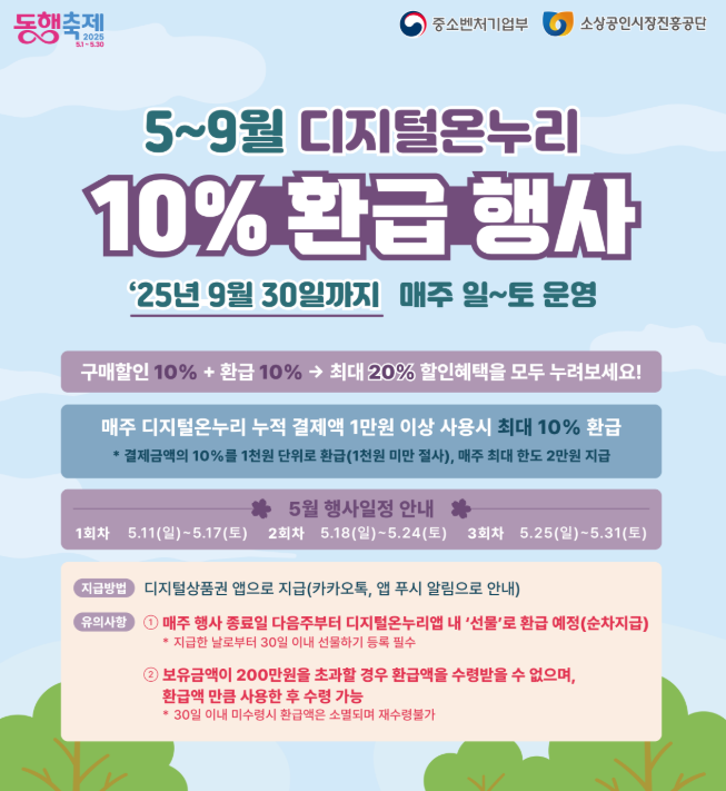 혜택이 많은 온누리 상품권 잘 지용하고 계신가요?  이번에 환급 행사를 진행하고 있는데요. 5월부터 매주 환급해주는 디지털 온누리상품권 행사 전통시장과 골목상권 활성화를 위해 정부가 진행하는 소비 촉진 프로그램이라고 합니다. 2025년 5월 11일부터 9월 30일까지 진행되는 이번 행사에서는 디지털 온누리상품권(모바일 또는 카드형)으로 결제 시, 회차별 누적 결제금액의 최대 10%를 동일한 디지털상품권으로 환급받을 수 있다고 하니 확인하시고 함께 혜택 받아요.